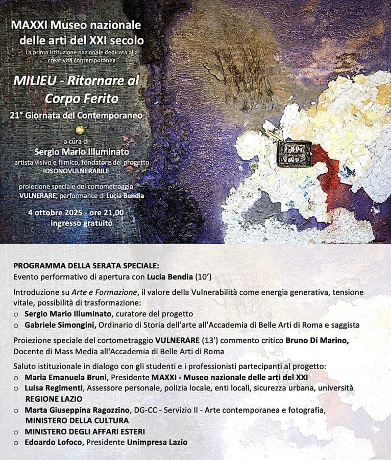 Sotto il titolo MILIEU – Ritornare al corpo ferito, l’iniziativa, a cura di Sergio Mario Illuminato, artista visivo e filmico e fondatore del progetto IOSONOVULNERABILE, offrirà al pubblico un’esperienza immersiva in cui la fusione tra arti visive, cinema, performance teatrale, musica e fotografia ridefinirà il concetto stesso di vulnerabilità come energia generativa.