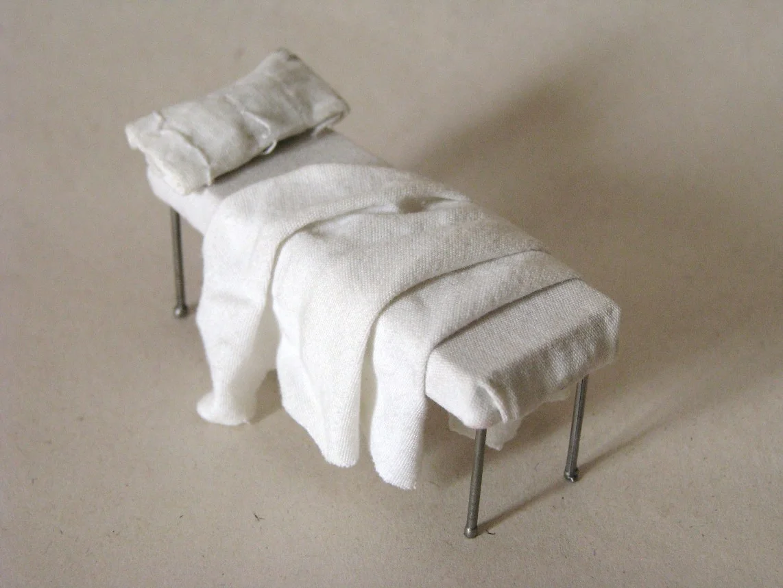 Lavora come un cesellatore usando dei materiali poveri. Questi piccoli letti fanno subito pensare a dei lettini di guerra, di ammalati o di riposo. Sono comunque immagini fortemente evocative. Possono ricordare scultori come Zumbo nella serie delle cere del Museo della Specola di Firenze o un'immagine come il letto d'ospedale di Lorenzo Viani, ma loro, queste crisalidi, dormono. Altri lettini ricordano il riposo e l'archetipo di un letto antico costruito molte volte con una tensione barocca, come la Beata Ludovica Albertoni. Questa mostra è dedicata a Florence Nightingale, una delle ispiratrici della Croce Rossa, che a lume della lampada ispezionava i giacigli dei combattenti durante la Guerra di Crimea del 1853-56.