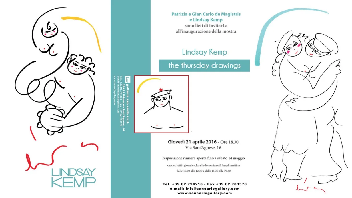 Alla Galleria San Carlo, via Sant’Agnese 16, 20123 Milano, la personale di Lindsay Kemp “The thursday drawings”, da giovedì 21 aprile 2016 fino a sabato 14 maggio. All’inaugurazione (dalle 18,30) sarà presente l’artista.
