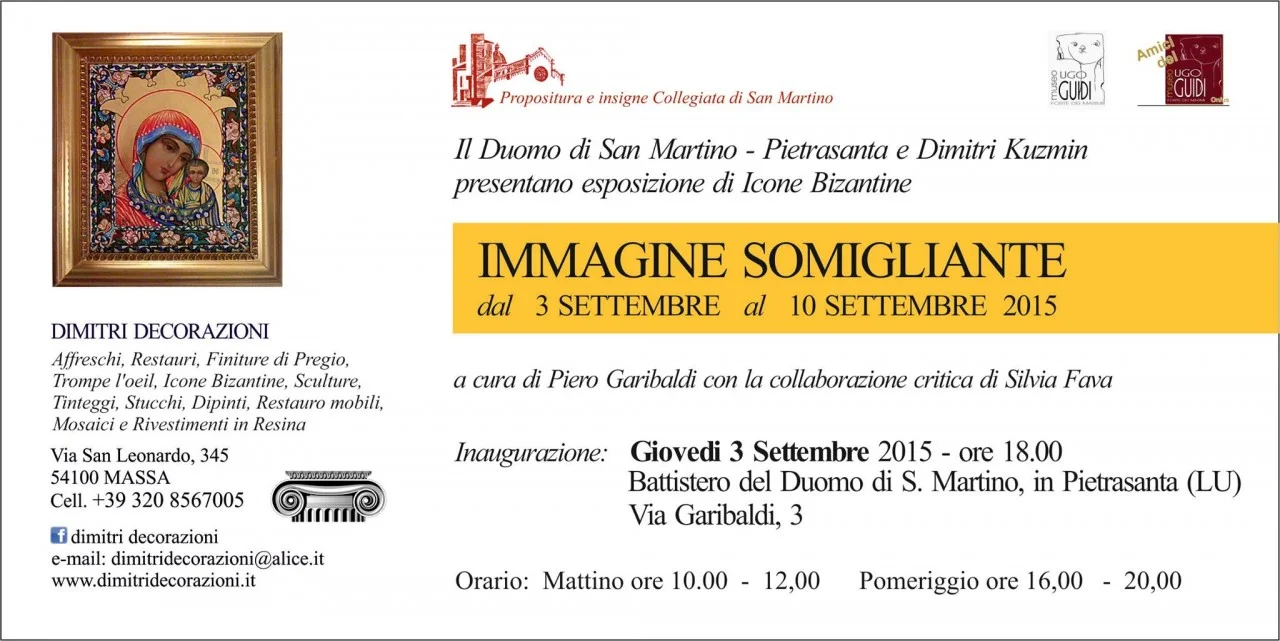 Dal 3 al 10 Settembre una serie di icone, frutto di pregiate tecniche miste su legno, diffondono nel contesto del Battistero del Duomo di Pietrasanta “Immagine Somigliante”, testimonianza del percorso professionale internazionale del maestro d'arte russo, naturalizzato italiano, Dimitri Kuzmin.