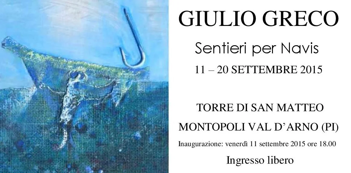 Venerdì 11 settembre prossimo presso la Torre di San Matteo, a Montopoli Val d'Arno (Pi), si inaugura la mostra personale di Giulio Greco (Caselle in Pittari, 1949), dal titolo Sentieri per Navis.
