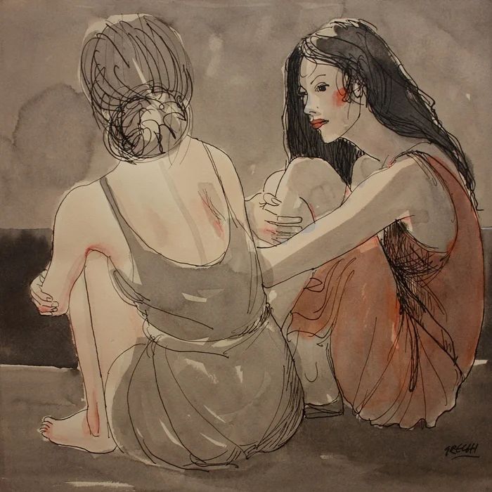 “E’ il mistero dell’immortalità dell’opera che alle donne di Grechi sembra non bastare. Bellissime, eteree, divine e sospese. Autentiche e carnali, pronte a barattare giovane bellezza per un respiro o un passo fuori dalla carta o dalla tela … Nell’opera del maestro vive la traccia di una storia di umana natura: femmina. L’evocazione dello spirito donna è affidata al gesto da cui Grechi genera il segno. L’ombra e la luce si perdono nell’acqua che diluisce uno sguardo nato dalla china, quando incontra il mare … La postura è esatta ma mai immobile, mai “troppo bella” quell’anatomia normale dipinta da Grechi; armonia purissima della forma libera bloccata all’apice di un gesto in divenire … Davanti al desiderio di ritrarre l’immagine di un universo impalpabile e complesso, la carta pesa e il tratto s’inspessisce nella ripetizione: sicuro, sovrapposto, trascinato nell’acqua per descrivere lo scintillio di un umore affinché l’opera regali l’impressione dell’espressione. Leggerissima la carta che sostiene le femmine di Grechi, come il pensiero che le accompagna con continua ricerca. Leggero come il respiro che, se ti avvicini all’opera, puoi sentire: vento o brezza leggera, a seconda dell’umore. A seconda del mare visto da un’isola”. R.G.