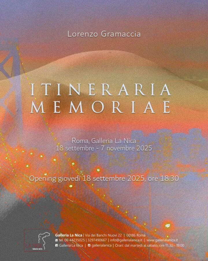 Giovedì 18 settembre 2025 alle ore 18.30 verrà inaugurata alla Galleria La Nica di Roma, sita in via dei Banchi Nuovi 22, “Itineraria Memoriae”, mostra personale di Lorenzo Gramaccia, a cura di Maria Vittoria Marchetta, che presenterà al pubblico gli esiti più recenti della sua ricerca artistica. L’evento sarà altresì inserito nella cornice dell’inaugurazione del Ponte Art and Design District, distretto dedicato al design, all’arte contemporanea, all’artigianato e all’antiquariato.