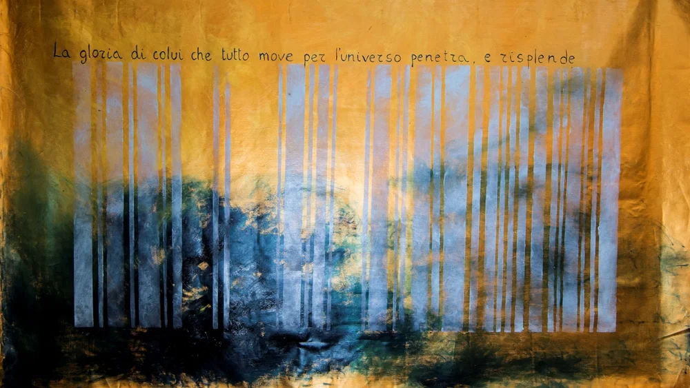 Il lavoro su Dante è legato alla serie degli Isbn. Presentato a Parigi (nel prestigioso Espace en Cours diretto da Julie Heintz) riprende gli incipit dell’Inferno, del Purgatorio e del Paradiso, unitamente a versi di grande fama e presa, culturale e visionaria. Recensiti in modo appassionato da Derrick de Kerckhove, i quadri mettono insieme dimensioni poetiche e tecnologiche, alfabeti e algoritmi, colori e linee.