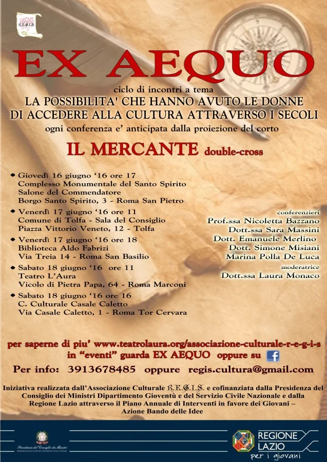 Ex Equo - La possibilità che hanno avuto le donne di accedere alla cultura attraverso i secoli. É questo l'argomento che dal 16 al 18 giugno verrà affrontato in un ciclo di conferenze tenute da docenti universitari, ricercatori ed esperti. Molti i siti interessati: Complesso Monumentale del Santo Spirito, Comune di Tolfa, Biblioteca Aldo Fabrizi, Teatro L'Aura, Circolo Culturale Casale Caletto.