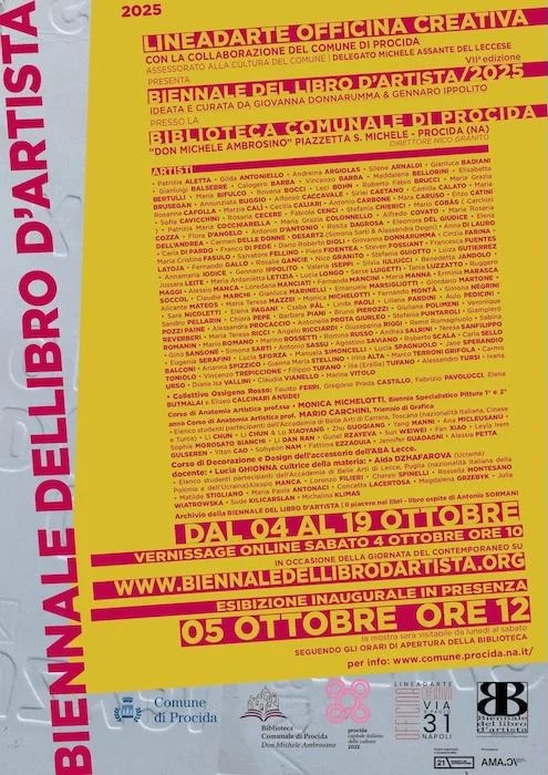 La Biennale del Libro d’Artista torna a Procida alla Biblioteca Comunale di Procida “Don Michele Ambrosino” dal 05 al 19 ottobre, diretta da Nico Granito con la collaborazione del Comune di Procida - Assessorato alla cultura del Comune, delegato Michele Assante del Leccese, confermandosi come uno degli appuntamenti più attesi nel panorama dell’arte contemporanea e dell’editoria creativa. L’evento, giunto alla sua VIIª edizione, riunisce artisti, collezionisti e appassionati da tutto il mondo per celebrare il libro come opera d’arte, luogo di sperimentazione e veicolo di idee.