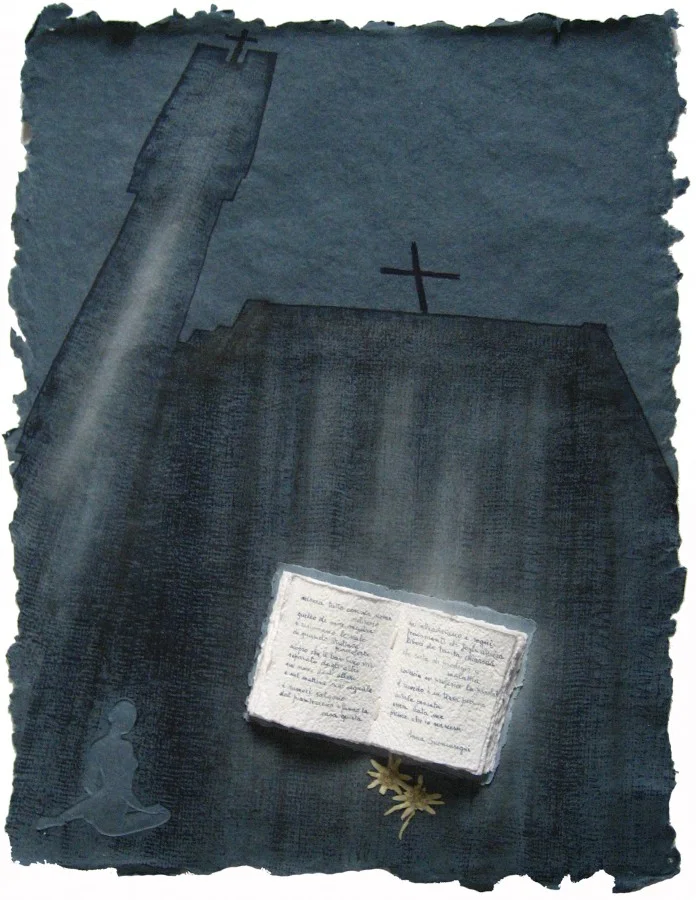 E’ questa la ragione per la quale, benché in esse ci sia ancora dato riconoscere scritture, architetture ed altro, queste sette opere non possono non essere considerate astrazioni, rappresentazioni che virano a energia pura nel mentre che il suono delle parole e l’apparire dei luoghi si dissolvono nella rinnovata sintonia con l’assoluto.