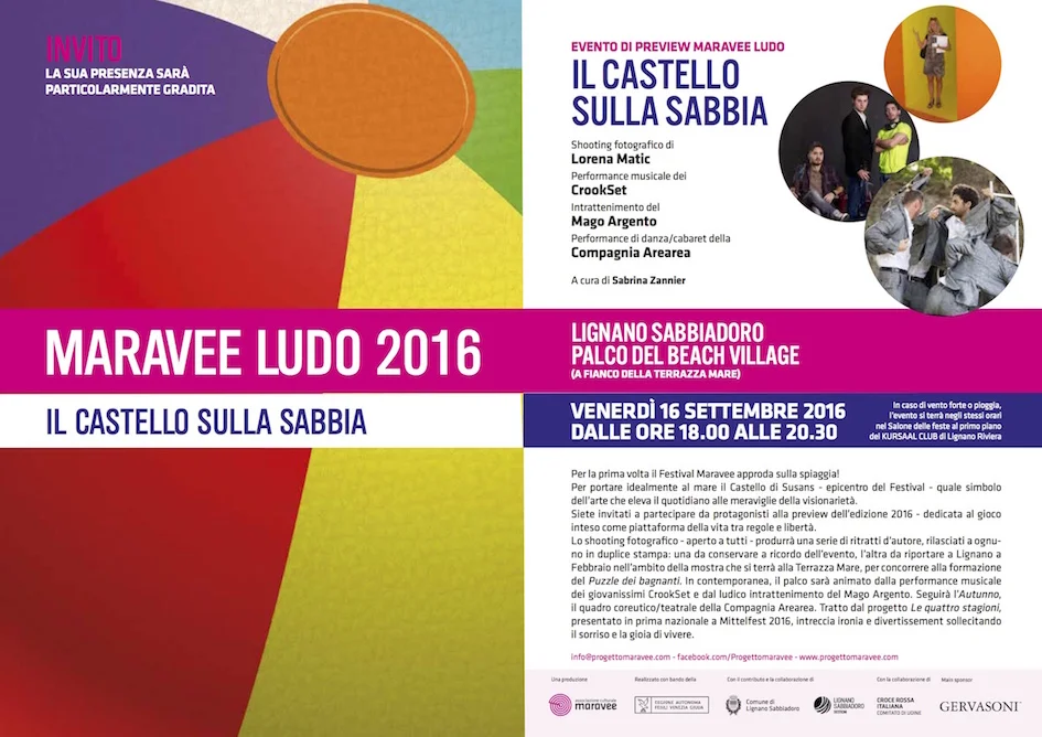 L’appuntamento con la preview di Maravee Ludo - che propone l’evento intitolato Il Castello sulla sabbia - è venerdì 16 settembre dalle ore 18.00 alle ore 20.30 sul Palco del Beach Village di Lignano Sabbiadoro, a fianco della Terrazza Mare, che a febbraio sarà sede della mostra intitolata Ludo Park. Grazie alla collaborazione e al contributo del Comune di Lignano Sabbiadoro, entrato a far parte del progetto con ben due appuntamenti, supportati dalla disponibilità di Lisagest, l’edizione 2016 del Festival ideato e diretto da Sabrina Zannier e gestito dall’Associazione culturale Maravee - con il sostegno della Regione, del main sponsor Gervasoni e del Comune di Gemona del Friuli – espande i propri confini geografici e temporali approdando in ben undici location e otto mesi di programmazione.