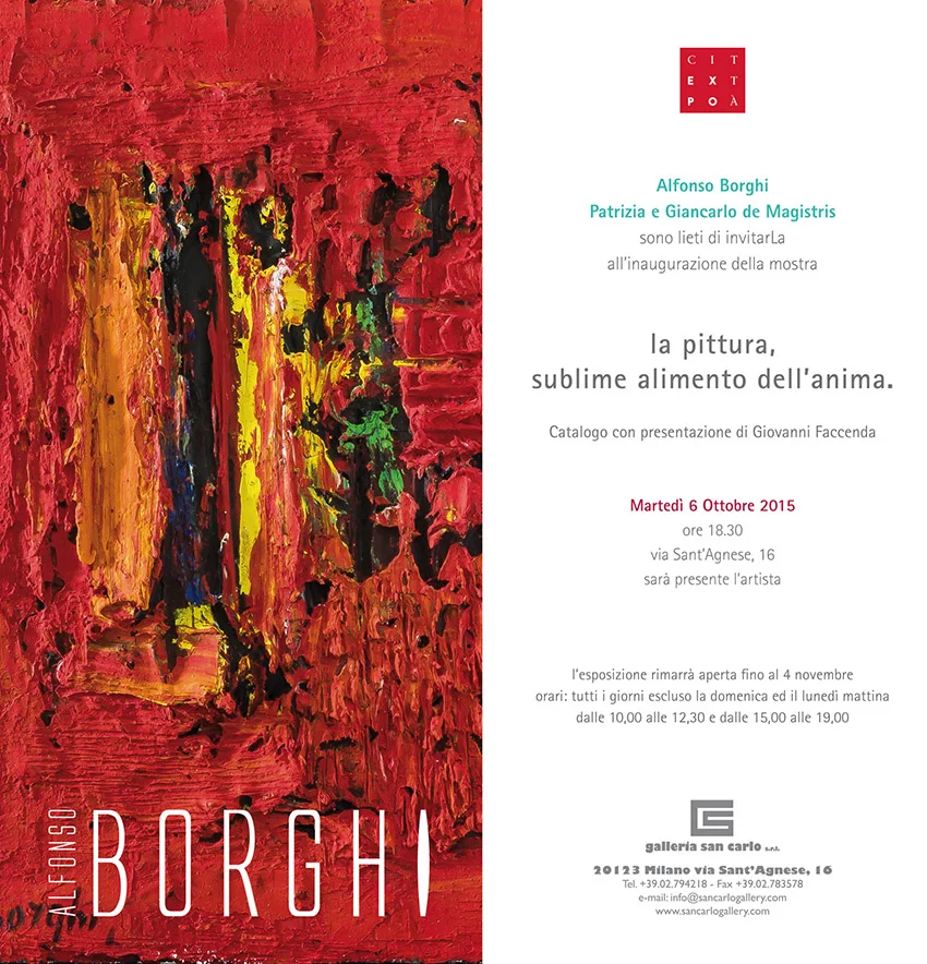 La Galleria San Carlo di via Sant'Agnese 6, 20123 Milano, www.sancarlogallery.com, il 6 ottobre dalle ore 18,30, presenta la personale di Alfonso Borghi "La pittura sublime alimento dell'anima".