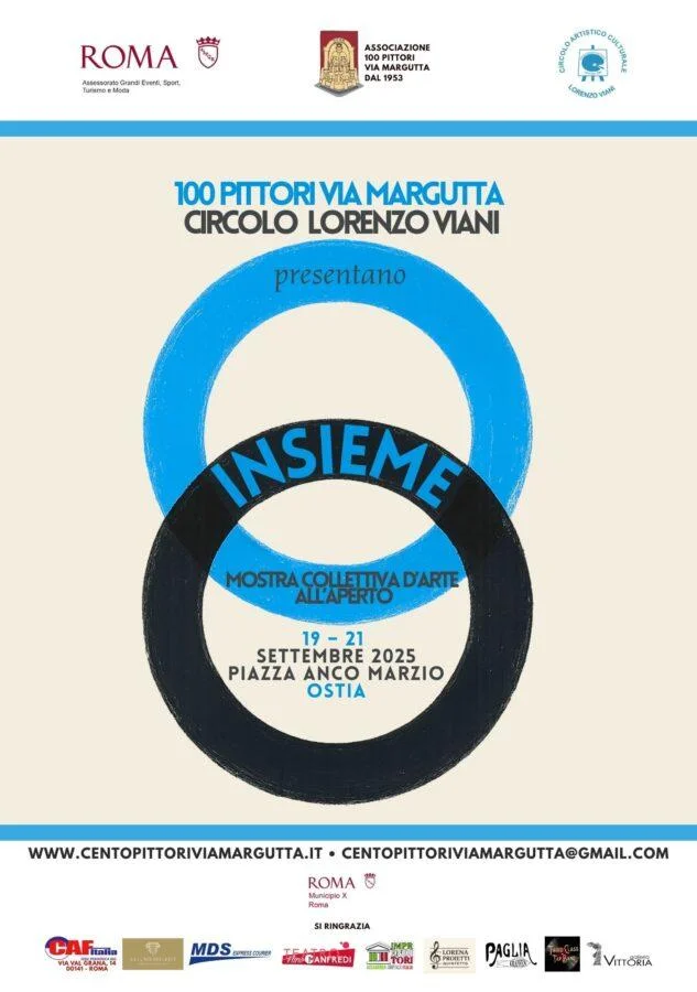 Si svolgerà a Ostia, in Piazza Anco Marzio, dal 19 al 21 settembre 2025, la manifestazione culturale “INSIEME” che vedrà per la prima volta due storiche realtà artistiche insieme, i “100 Pittori Via Margutta” - nata nel 1953 nella storica via della Capitale - e il “Circolo Artistico Lorenzo Viani”, nato nel 1984 al Lido di Ostia.