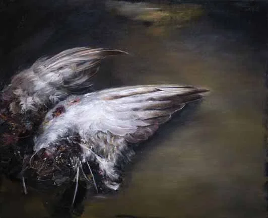 Due quadri, Damp Mop, del 2015, e Ombra ammonitrice VI (Awrah), del 2004, costituiscono l’ideale nucleo dialogico della mostra, fatta di pitture imponenti, discrete, a volte, ed esuberanti, antiche. «Damp Mop è in inglese lo straccio umido, quello per lavare i pavimenti. È il titolo che ho dato a un quadro che rappresenta un paio d’ali rotte, strappate dalla carne viva, e la ferita ribolle di materia pittorica densa e grumosa. Del corpo vivo rimane null’altro che questo straccio, per parte flaccido e inerme. L’ala è bianca, dove la ferita non ha inquinato il suo candore, di un bianco calcinato, stridore su tutti i colori. È la nostra equivalenza interiore. Rovescia la nostra fisicità ordinaria, limitante, orizzontale, ed è capace di darci l'emblema di un fatto, non già il suo simbolo didascalico, ma quel fatto individuato in tutta la sua energia: la morte, terribile, che nella bellezza del bianco permette alla forza dello spirito di non inorridire davanti alla consunzione della carne. Allora l’ala del mio dipinto doveva avere un atteggiamento composto, ho cercato di darle un equilibrio pacato, non un ardore espressionista. Mi sono ricordato del cavallo di George Stubbs per il marchese di Rockingham intitolato Whistlejacket. L’ho dipinta su un fondo senza profondità, proprio come è dipinto il cavallo, affinché fosse, in termini di rimemorazione, un altro monumento, o forse sempre lo stesso. Con sforzo ho considerato di sviluppare questa forma fino a renderla monumento così da tramandare tutto ciò che è strettamente connesso con la mortalità dell’essere-nel-mondo. Non voglio parlare di origine e di verità, ma di sforzo, di messa in opera di qualcosa che per me è implicito, addirittura non pensato». (Pietro Geranzani)