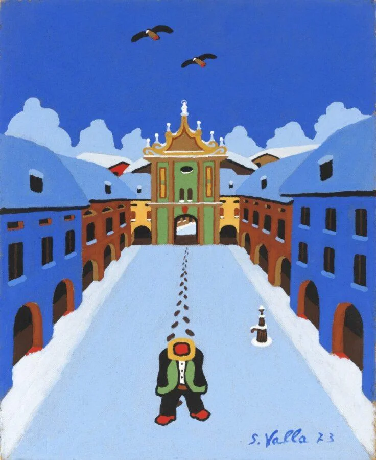 «Serafino Valla è una voce autentica ed onesta dell’arte contemporanea italiana, un maestro che, da eccellente disegnatore, decide di esprimersi con un linguaggio naïf rivisto per raggiungere una serie di obiettivi creativi per lui integrati alla vita e al senso della memoria e della testimonianza», dichiara Giammarco Puntelli. «Con Serafino Valla – prosegue il curatore – si alza dalla mostra antologica la voce di un filosofo e di un poeta, capace di respirare i luoghi del suo vissuto e di portare, fra terra e cielo, la sacralità della vita attraverso una visione non limitata neppure dalla morte ma proiettata, attraverso la speranza che non delude, verso un orizzonte ulteriore».