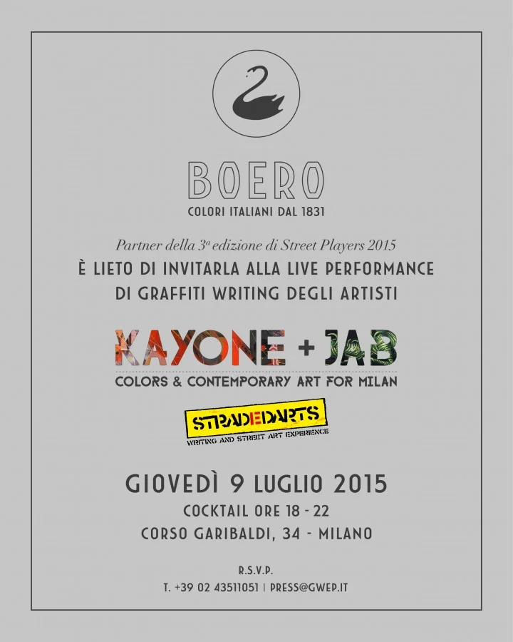 Dopo aver preso parte alla terza edizione di Street Players, che si ripete ogni due anni all’Ippodromo del Galoppo, BOERO, la più antica azienda di vernici italiana, invita JAB, vincitore ex equo con altri tre artisti dell’evento, e KAYONE, da tempo riconosciuto come uno dei più importanti graffiti writer italiani, per una live performance giovedì 9 luglio nel concept store in corso Garibaldi 34 a Milano.