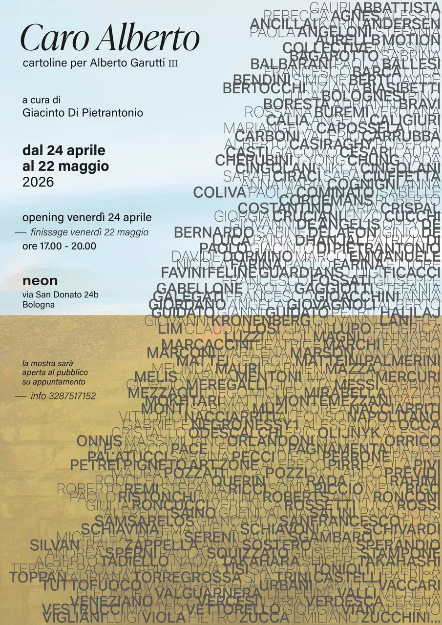 La mostra “Caro Alberto” è stata ospitata per la prima volta nello spazio non profit Tempesta a Recanati (27 luglio - 29 settembre 2024) e successivamente presso Alvèus Studio a Roma (19 ottobre - 24 novembre 2024); sabato 8 febbraio 2025 l’Accademia di belle arti di Bologna ha reso omaggio ad Alberto Garutti con un incontro sul lavoro artistico, la didattica e i ricordi legati alla figura dell'artista e con l’affissione di una targa commemorativa sulla porta dell'aula di Alberto Garutti, titolare della cattedra di Pittura all’Accademia di Belle Arti di Bologna dal 1990 al 1994. A conclusione le 253 cartoline postali realizzate nell’ambito del progetto Caro Alberto sono state donate allo Studio Alberto Garutti. neon ha sempre avuto una forte relazione con Alberto Garutti artista e docente. Garutti portava i suoi studenti a visitare le mostre di altri giovani artisti e invitava Gino Gianuizzi (neon) nella sua aula in Accademia. Un rapporto di stima e di amicizia che ha attraversato gli anni.