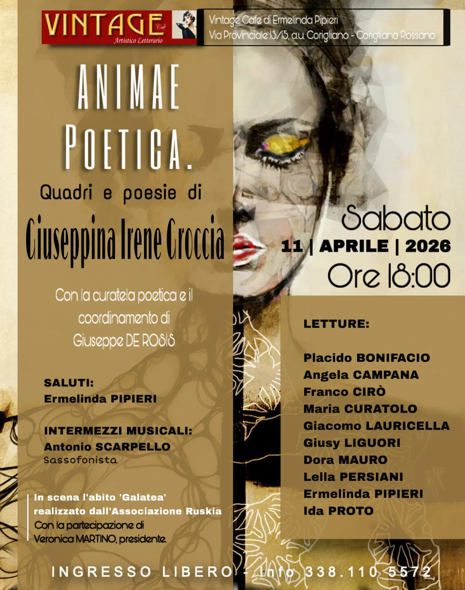 Un intreccio di linguaggi, visioni e sensibilità darà vita a Animae Poetica, la mostra personale di Giuseppina Irene Groccia, in programma sabato 11 aprile 2026 alle ore 18, presso il Vintage Café artistico letterario di Ermelinda Pipieri a Corigliano Rossano, area urbana Corigliano, via Provinciale 13/15. Un progetto che unisce arte visiva e scrittura poetica, due espressioni della stessa ricerca interiore che, nella pratica dell’artista, si incontrano e si rispecchiano in un dialogo intimo e continuo.