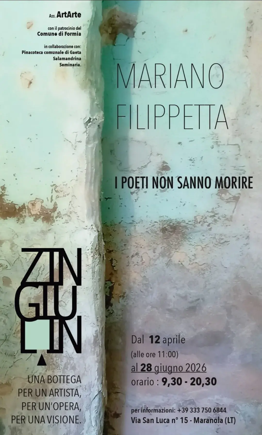 Lo Spazio Zingiulin di Maranola ( LT) ospita dal prossimo 12 aprile 2026, I poeti non sanno morire, progetto artistico di Mariano Filippetta che nasce dall’incontro e dal dialogo con la riflessione poetica del giovane autore Mattia Tarantino.
