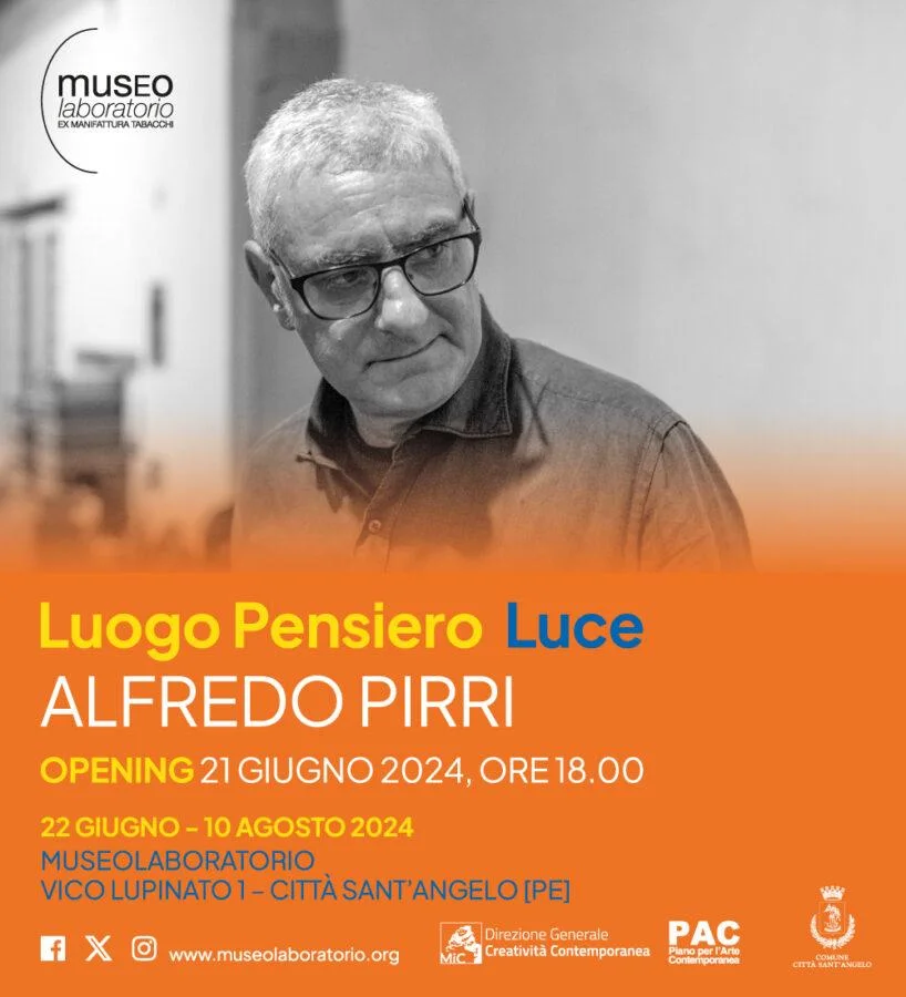 Dal 21 giugno al 10 agosto 2024, il Museolaboratorio d’Arte Contemporanea di Città Sant’Angelo (Pe) presenta Alfredo Pirri. Luogo Pensiero Luce, progetto realizzato con il sostegno del PAC 2022-2023 - Piano per l’Arte Contemporanea, promosso dalla Direzione Generale Creatività Contemporanea del Ministero della Cultura. L’opera site-specific realizzata dall’artista dal titolo “Compagni e Angeli - per Città Sant’Angelo” sarà inaugurata al pubblico venerdì 21 giugno, alle ore 18, entrando a far parte della collezione del museo, e sarà visitabile da giovedì a sabato dalle 17 alle 21, e la domenica su appuntamento dalle 11 alle 14.