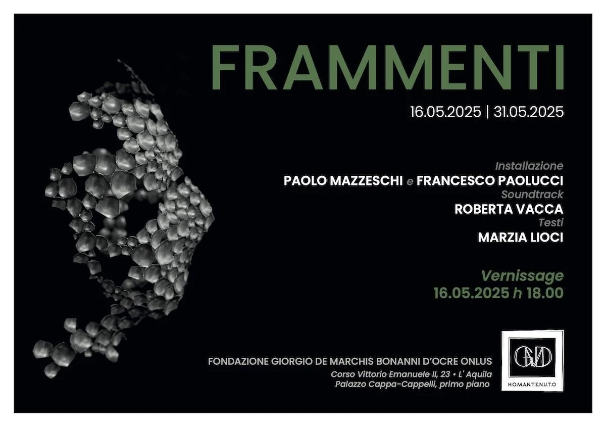 Venerdì 16 maggio 2025 alle ore 18.00, presso la sede della Fondazione de Marchis, al primo piano di Palazzo Cappa Cappelli, la Fondazione Giorgio de Marchis Bonanni d'Ocre è lieta di ospitare il progetto Frammenti, composto da un’installazione di elementi in titanio realizzata dall’artista Paolo Mazzeschi e da un cortometraggio del regista e giornalista Francesco Paolucci, in collaborazione con la compositrice Roberta Vacca e l’artista Marzia Lioci.