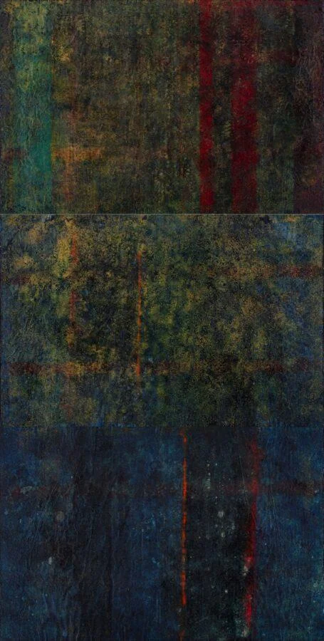 Il progetto di Fabio Iemmi (Montecchio Emilia, 1952), intitolato Metacantieri – Vibrazioni sonore della materia, è allestito nelle ultime due sale del piano terra. Una sequenza di opere materiche a parete con inediti e l’installazione Codici, opere tessili realizzate su catene Gobelin e jacquard con titoli in lana, lino, lurex.