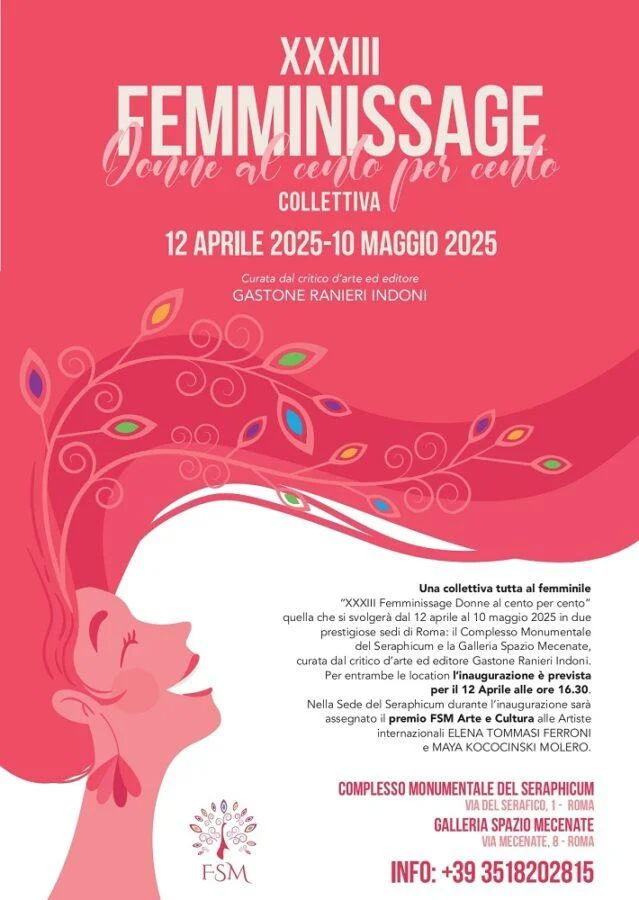 Una collettiva tutta al femminile “XXXIII Femminissage Donne al cento per cento” quella che si svolgerà dal 12 aprile al 10 maggio 2025 in due prestigiose sedi di Roma: il Complesso Monumentale del Seraphicum a Via del Serafico all’Eur e alla Galleria Spazio Mecenate, a Via Mecenate 8, curate dal critico d’arte ed editore Gastone Ranieri Indoni.