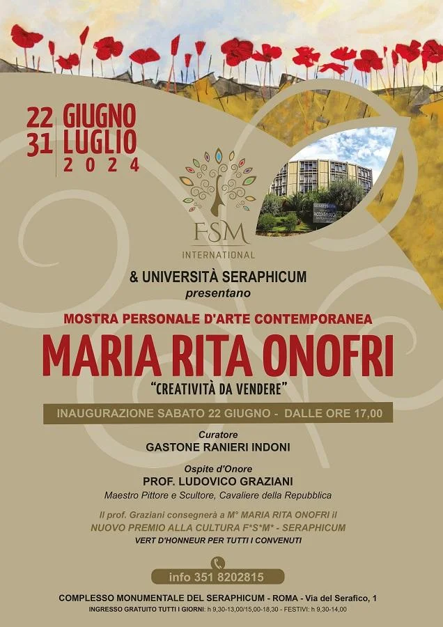 Sarà presentata il prossimo 22 giugno dalle ore 17.00 "Creatività da vendere", la personale della pittrice, scultrice e orafa Maria Rita Onofri presso il Complesso Monumentale della Pontificia Facoltà Teologica "San Bonaventura" Seraphicum di Via del Serafico, 1 a Roma, a cura del critico d’arte e direttore artistico delle mostre del Seraphicum, Gastone Ranieri Indoni.