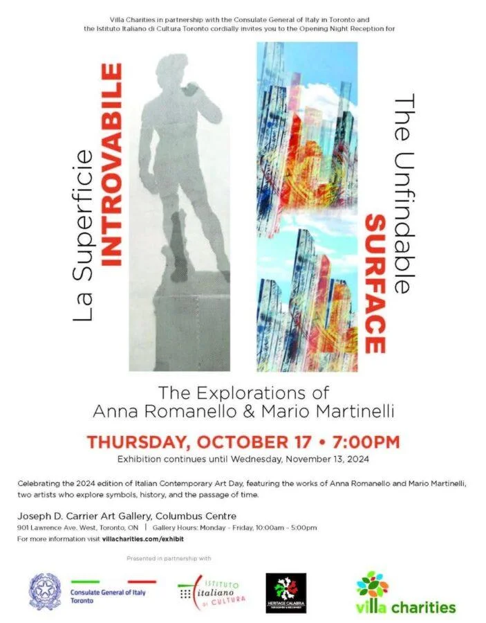 Il Consolato Generale d'Italia a Toronto e l'Istituto Italiano di Cultura, in collaborazione con Villa Charities e con il supporto di Heritage Calabria, sono orgogliosi di presentare la mostra La Superficie Introvabile