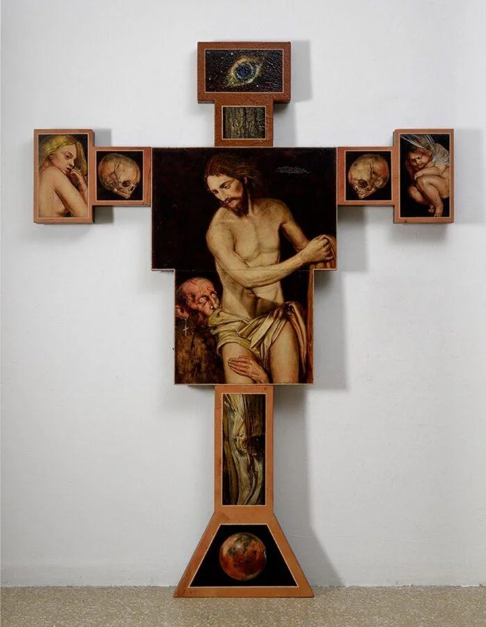 L’elemento formale della croce è una citazione dei crocifissi sagomati medievali di Giotto e Cimabue conservati a Firenze, e diventa la superficie pittorica per una narrazione composita in cui si intrecciano simbologia e narrazione, astratto e figurazione.