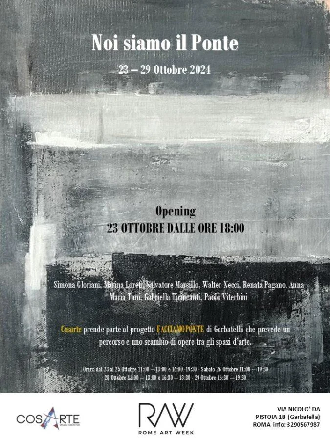 Dal 23 Ottobre al 29 ottobre, si terrà la Mostra collettiva ‘Noi siamo il Ponte’, presso la galleria Cosarte nel cuore di Garbatella. L’evento è inserito nel programma di Rome Arte Week 2024, la settimana dell'arte contemporanea che dal 21 al 26 Ottobre scandirà il ritmo della Capitale.