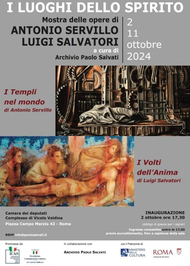 Inaugurerà al pubblico il prossimo 2 ottobre l’esposizione “I luoghi dello spirito” bi-personale degli artisti Luigi Salvatori e Antonio Servillo, a cura di Roberto Luciani, Alberto Moioli, Giuseppe Oddone e Andrea Salvati, promossa da ICAS Intergruppo Parlamentare “Cultura, Arte, Sport” e su iniziativa del Presidente della Commissione Cultura Onorevole Federico Mollicone, dell’Assessorato alla Cultura di Roma Capitale e del MIC e la collaborazione dell’Archivio Paolo Salvati.