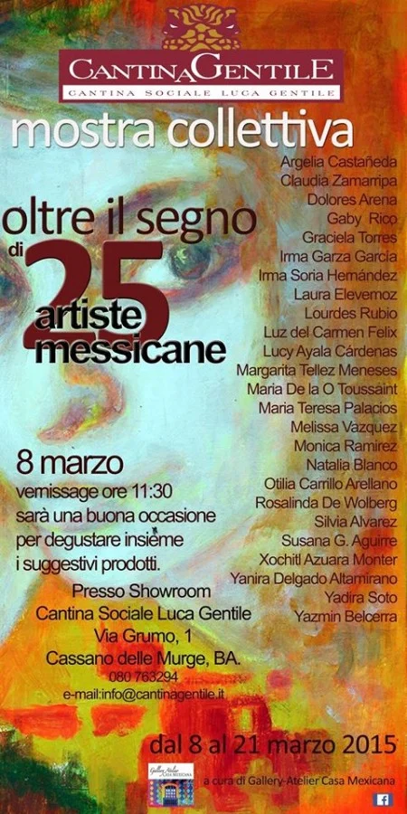 Nell’ambito delle iniziative culturali promosse dalla Cantina Sociale Luca Gentile, il giorno 8 marzo 2015 presso lo Showroom ,Mostra collettiva intitolata ''OLTRE IL SEGNO'' con opere realizzate da venticinque artiste messicane. La mostra è curata da Gallery-atelier Casa Mexicana che da diversi anni è impegnata in progetti di interscambio culturale tra Italia e Messico. Nella mostra vengono proposte al pubblico 25 opere inedite delle artiste realizzate con diverse tecniche come ad esempio acrilici, acquerello, incisione nel formato 60 x 40. Gli artisti partecipanti sono: Argelia Castañeda, Claudia Zamarripa, Dolores Arena, Gaby Rico, Graciela Torres, Irma Garza García, Irma Soria Hernández, Laura Elevemoz, Lourdes Rubio, Luz del Carmen Felix, Lucy Ayala Cárdenas, Margarita Tellez Meneses, Maria De la O Toussaint, Maria Teresa Palacios, Melissa Vazquez, Monica Ramirez, Natalia Blanco, Otilia Carrillo Arellano, Rosalinda De Wolberg, Silvia Alvarez, Susana G. Aguirre, Xochitl Azuara Monter, Yanira Delgado Altamirano, Yadira Soto e Yazmin Belcerra. L’inaugurazione della mostra avverrà alle ore 11:30 del 8 marzo 2015 e potrà essere visitata dal 8 al 21 marzo 2015 nei seguenti orari: lunedì e mercoledì: ore 10,30 alle 13 (mattina). martedì, giovedì e venerdì: ore 15 alle 18 (pomeriggio). sabato: ore10,30 alle 13 (mattina) – 16,30 alle 18,00 (pomeriggio).