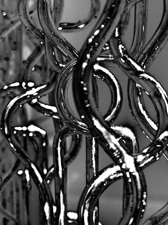 L’installazione percorribile della Nurigiani coinvolge il visitatore in un’Immersione fluida all’insegna della multisensorialità, anche uditiva (il sottofondo sonoro è del musicista e compositore Marco Visconti), che amplifica gli spazi e l’immaginazione: la geometria ritmica e ripetitiva delle barre di plastiche si raffina così in impercettibili e trasparenti strutture, a significare un percorso che dal materiale si eleva a danza mentale.