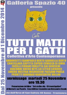 Il vernissage della Mostra “Tutti matti per i gatti” a cura di Tina Loiodice avrà luogo alla Galleria Spazio40 in via dell’Arco di San Calisto 40 Roma – Trastevere il 25 novembre 2014 alle ore 19.30.