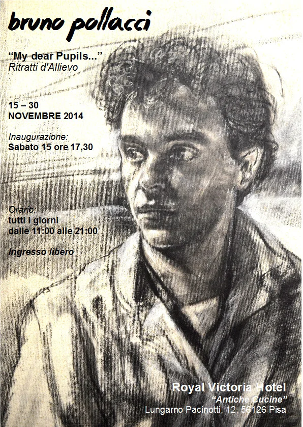“My Pupils – Ritratti d'Allievo” è il titolo della mostra personale di Bruno Pollacci, (pittore,grafico, scultore, fotografo e Direttore dell'Accademia d'Arte di Pisa), che si terrà dal 15 al 30 novembre nelle “Antiche Cucine” del prestigioso “Royal Victoria Hotel” di Pisa, in Lungarno Pacinotti, albergo storico nel quale ogni sala, ogni ingresso ed ogni dettaglio d'arredamento mette in evidenza una lunga e prestigiosa testimonianza storica, culturale ed artistica che affonda le sue radici architettoniche fino al 1100. La mostra è costituita da una sintesi selezionata di ritratti che Pollacci