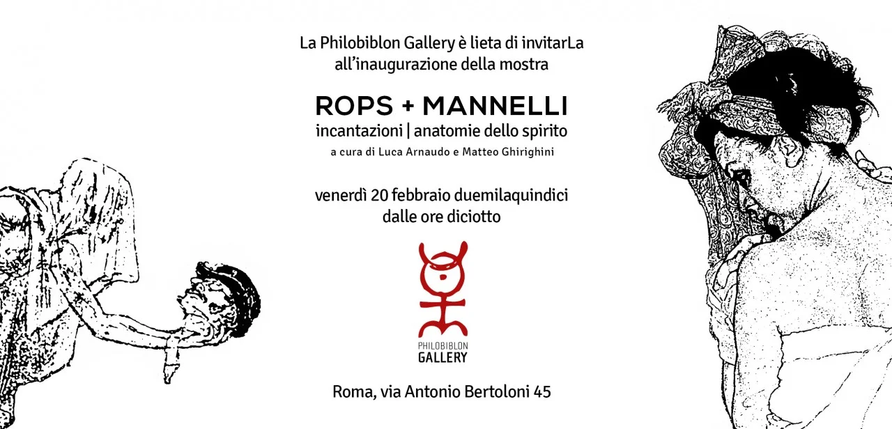 Riferimento fondamentale dell’illustrazione libraria e satirica ottocentesca il primo, protagonista assoluto della satira italiana il secondo, Rops e Mannelli condividono una dimensione figurativa dal potente impianto simbolista dove una fantasmagoria di visioni allucinate, spesso accese da un vitale erotismo, si alterna a dolenti quanto delicate meditazioni esistenziali, così svelando una condivisa attenzione per la natura umana che, mentre cattura appieno l’impressione psicologica e il carattere dei tempi, trascende le rispettive epoche, le loro cronache, i nostri vizi e le nostre virtù. Il corpo, reso con un’attenzione maniacale per il mezzo espressivo che ha portato i due artisti anche a sviluppare nuove tecniche esecutive, è l’assoluto protagonista visivo delle rispettive opere: un corpo mostrato in una fisicità spesso perturbante, che Mannelli e Rops impiegano magistralmente per disporre l’osservatore come alle soglie di una dissezione materiale nel corso della quale, solo a fissare meglio lo sguardo, quanto infine risulta è l’anatomia dello spirito in atto. Superato l’atrio della galleria dove campeggiano due lavori iconici di Rops e Mannelli, nella sala espositiva centrale il visitatore viene travolto dall’intensità dell’opera complessiva degli artisti, alternati tra loro al fine di rendere evidente l’affinità esistente tra le rispettive poetiche. La mostra prosegue quindi in una peculiare camera oscura dove l’atmosfera di un antico gabinetto di stampe si fonde con quella di un locale underground, per svilupparsi ulteriormente lungo le pareti della Libreria Philobiblon in un dialogo sorprendente con alcuni tesori bibliografici selezionati appositamente per l’occasione, tra cui una preziosa copia di quel Compendium Maleficarum che, in maniera più o meno evidente, viene citato in diverse opere esposte.