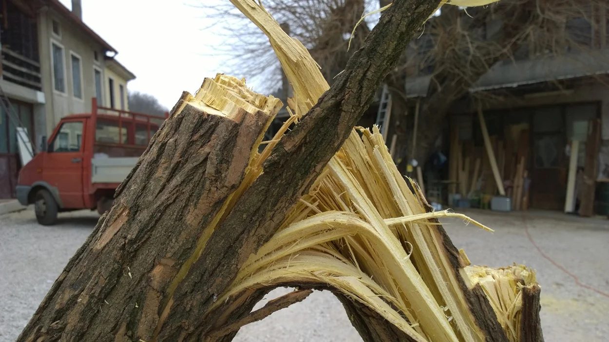 Una foresta di tronchi e fusti, che paiono quasi resti di un colonnato greco, come evocato da Disordine corinzio, una delle opere del percorso, andrà a ricreare all’interno delle antiche sale della tipografia una cattedrale di ossa vegetali, così come le intende Mattia Bosco, “ultimi fiori” che si dischiudono con un gesto violento, quello dello spezzare, mostrando tutto il proprio intimo mistero fatto di luce accumulata da queste travi nel corso degli anni. Le linee spezzate e chiuse formano dei triangoli, un simbolo sacro nato da un atto di forza compiuto dall’artista sul legno stesso, liberando la luminosità in esso contenuta e svelando così il “non visibile”, la vita che si cela all’interno degli alberi.
