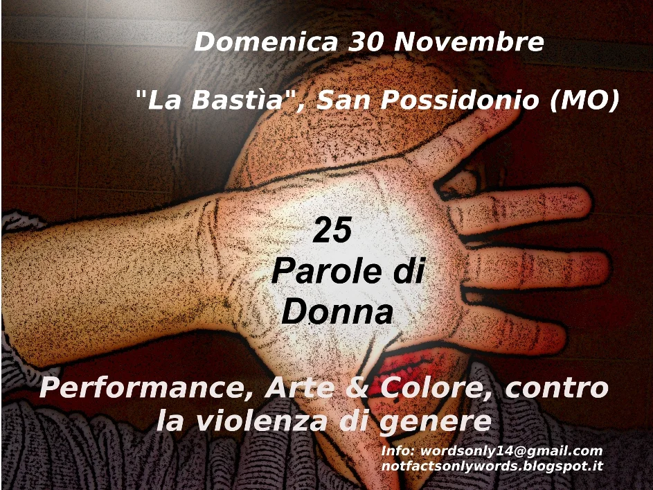 Dire stop alla violenza sulle donne sempre, ben oltre la giornata internazionale dedicata. E' questo sicuramente il messaggio insito nell'evento "25 Parole di Donna - Performance, Arte & Colore contro la violenza di genere", che si terrà domenica 30 novembre, dalle 14.30 alle 19 circa a "La Bastìa" di San Possidonio (Modena). Un'iniziativa live che coniuga arte, letteratura e informazione, grazie anche alla presenza di Gianna Morselli dell'Associazione VivereDonna Onlus di Carpi, che sarà intervistata dalla giornalista Angiolina Gozzi sul tema. Prima (e dopo), momenti di letture organizzate in una tornata non-stop che vedrà in scena autori e autrici di tutta Italia. Poesie, monologhi, racconti accesi da note e tocchi di colore saranno proposti a un pubblico invitato a una partecipazione libera. Il tutto si svolge in una location cruciale: un locale posto in uno dei comuni colpiti dal sisma del maggio 2012. Due messaggi in uno: "il no alla violenza" e la voglia di portare un evento unico nel suo genere, in un territorio ancora provato dal terribile evento che ha sconvolto la vita di migliaia di persone.