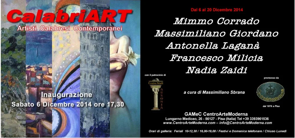 Si inaugurerà sabato 6 Dicembre 2014 alle ore 17,30 a cura di Massimiliano Sbrana, presso il GAMeC CentroArteModerna di Pisa (sul Lungarno Mediceo al numero 26), patrocinato dal Centro Studi Ausonia, nell'ambito del Progetto "Itinerari Artistici d'Italia" la mostra "CalabriART : Artisti Calabresi Contemporanei" che ospiterà le opere di 5 importanti e noti esponenti dell'arte calabrese contemporanea ossia Mimmo Corrado, Massimiliano Giordano, Antonella Laganà, Francesco Milicia e Nadia Zaidi