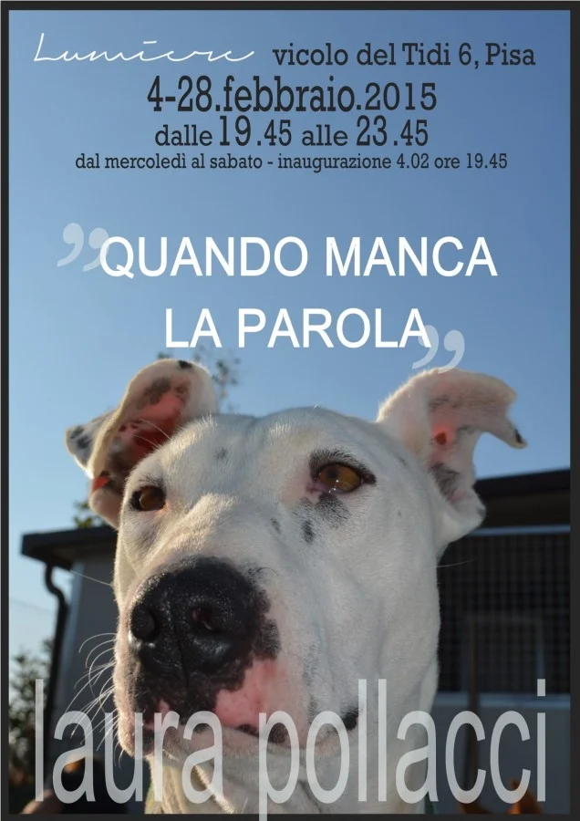 Nel Foyer del "Lumiere" di Pisa, in Vicolo del Tidi, 6, a Pisa, Mercoledi 4 Febbraio, si apre "Quando Manca La Parola", mostra personale di Fotografia di Laura Pollacci , giovane Grafica e Fotografa pisana (...seppur nata a Viareggio...) formatasi al Liceo Artistico di Lucca. "Figlia d'arte" (...il padre è Bruno Pollacci, pittore, grafico, fotografo e Direttore dell'Accademia d'Arte di Pisa e la madre è la pittrice Paola La Rosa...) Laura Pollacci si presenta al pubblico pisano con questa sua prima mostra personale fotografica che ha per tema i cani abbandonati ed ospiti del canile "Il Frutteto di Fido" di Nodica (PI), per il quale la giovane artista presta da tempo la sua amorevole ed appassionata opera di volontariato. La mostra vive degli scatti fotografici nati durante i diversi momenti di condivisione con gli "ospiti" del Rifugio, a volte durante il rapporto fisico, diretto ed affettuoso, all'aperto, con loro, ed a volte durante la loro custodia protetta negli spazi di ricovero. Espressioni e movenze degli "amici pelosi" vissuti sul sottile filo dell'emozione, in un contesto di intimo e "fraterno" dialogo, capace di testimoniare un'attenzione amorevole verso questi "compagni d'avventura" attraverso un occhio sensibile e creativo.
