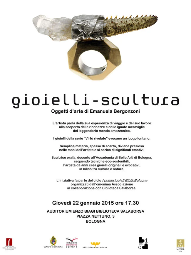 Piume di uccelli ara, semi, vertebre di squalo e di serpente, ma anche denti di squalo tigre, chele di granchio rosso delle mangrovie, geodi di agata e topazio imperiale. Materiali poveri di origine animale, vegetale e minerale che Emanuela Bergonzoni ha raccolto nel 2012 a Belèm, capitale dello stato del Parà, in Brasile, durante un viaggio di interscambio organizzato dall’Accademia di Belle Arti, e con cui ha realizzato la collezione ‘Virtù rivelate’: venti gioielli che vogliono essere un grido di protesta, di dolore, di gioia, di una maggiore presa di coscienza ambientalista. Nei suoi monili Emanuela ha inserito i materiali originali o, in alcuni casi, le loro riproduzioni in ottone, bronzo e argento. Quattro mesi di lavoro per tradurre le esperienze sensoriali vissute in Brasile in piccoli oggetti tridimensionali. Per i titoli di alcune opere è andata alle radici del linguaggio del Brasile, antecedente la colonizzazione: la lingua tupi, mentre per altri ha utilizzato la lingua latina, inglese, italiana e portoghese creando un melting pot linguistico che vuole essere un ponte intellettuale tra due continenti e la loro antica storia. Un progetto che attinge dalla biodiversità amazzonica nella sua interezza e che oggi è diventato anche un catalogo in italiano e portoghese edito da Universitas Studiorum.