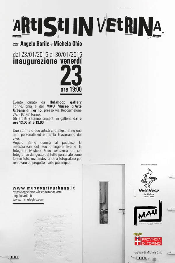 Due vetrine e due artisti che allestiranno una mini personale ed entrambi lavoreranno dal vivo . Inaugurazione della bi personale sarà il 23 gennaio ore 19 preso Hulahoop gallery Torino-Roma di via Rocciamelone ,7 sede del MAU Museo d'Arte Urbana di Torino