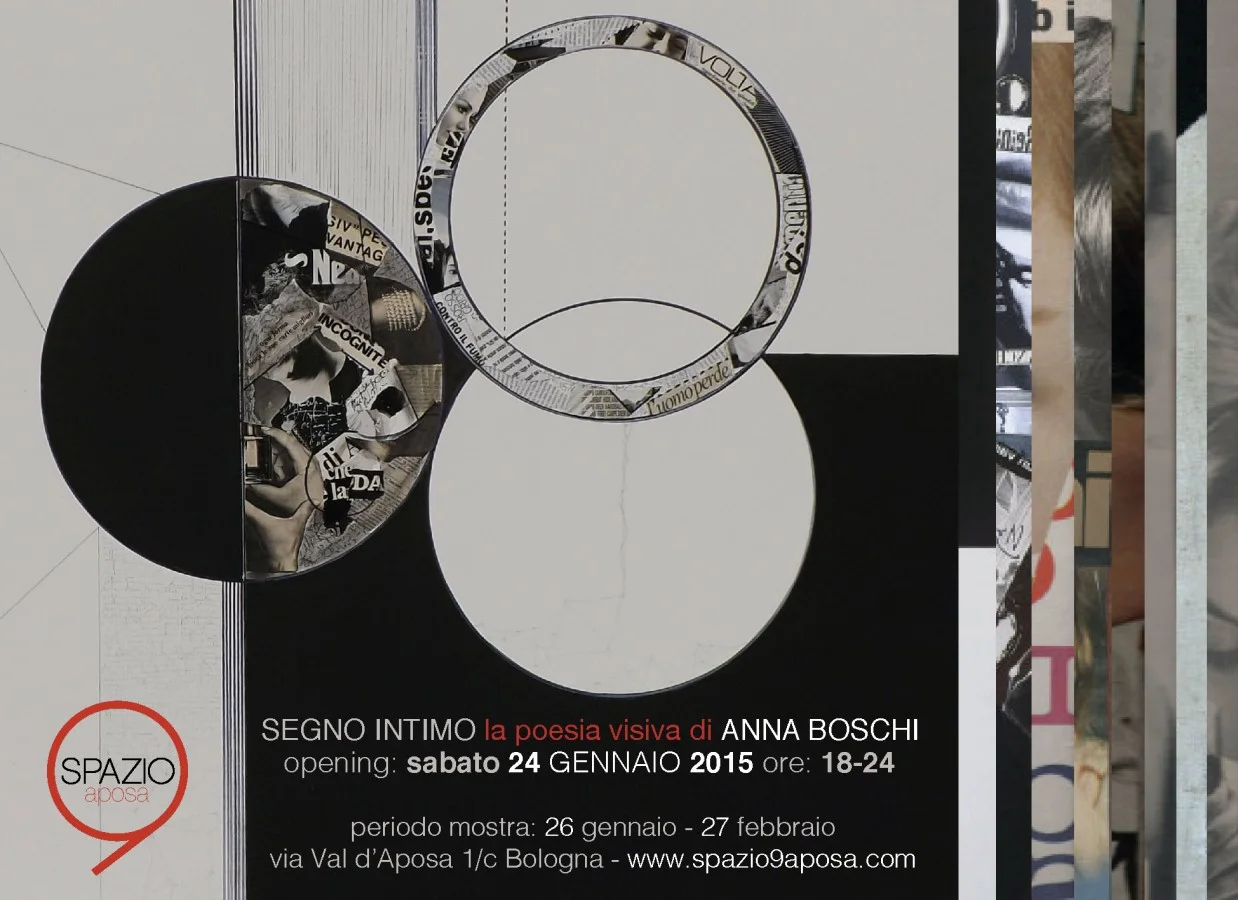 Inaugura sabato 24 gennaio 2015, in concomitanza della White Night Arte Fiera 2015, presso Spazio9, via Val d’Aposa 1/C a Bologna, “Segno Intimo – La poesia visiva di Anna Boschi” mostra personale dell’artista emiliana Anna Boschi che da più di quarant’anni indaga e sperimenta la poetica del segno, inteso come risultato dell’estrapolazione e della sintesi tra pittura, scrittura e immagine. Nel clima avanguardistico dell’Italia di fine anni ’60 si sviluppa una corrente detta Poesia Visiva o Visual Poetry, che si pone l’obiettivo di scardinare il linguaggio standardizzato della comunicazione visiva e del linguaggio, attraverso una estremizzazione del segno grafico e un uso anti-precostituito dell’immagine pubblicitaria. In questo senso significante e significato perdono il loro senso originario verso una nuova libertà di espressione, in un connubio tra fisicità ed emotività, quotidianità e intimità. Anna Boschi si inserisce a pieno titolo come artista poetico-visiva all’interno di questa corrente di sperimentazione, proponendo lavori che fanno della parola stampata e scritta, e delle immagini “comuni, la base per astrarre e contemporaneamente creare nuovi collegamenti e significati. Nata a Bologna, dove tuttora vive, quest’artista lavora su linea, colore e immagine, utilizzando tecniche diverse, dal collage alla colatura del colore “pieno” quasi informale, dai libri d’artista alle installazioni, su diversi supporti e materiali come legno e juta. La sua ricerca, che dura da più di quarant’anni, volge lo sguardo al mondo della comunicazione, utilizzando i suoi stilemi ma capovolgendone il senso, utilizzando l’ironia e la critica sottile per mettere in discussione l’iconicità diretta del segno-immagine e della parola. Nelle sue opere ritagli di giornale e figure perdono il loro significato originale e, unendosi alla parola scritta a mano, rivelano una nuova intimità e profondità. Si potrebbe parlare di appunti privati di un diario segreto che l’artista mette a disposizione di chi saprà interpretarne il contenuto, svincolato da un tempo e da uno spazio, estratti liberamente dall’inconscio. Anna Boschi non manca di citare e chiamare alla memoria poeti e artisti a lei vicini, da Neruda a Pessoa, da Perec a Hesse, Guillermo Deisler e Jiří Kolář. I suoi lavori rivelano una dimensione femminile e delicata. Una raffinatezza e eleganza che riportano alla sensibilità dell’artista: le sue opere sono infatti lo specchio della sua anima, riportano i segni del suo passaggio e del suo intelletto. A partire dai lavori degli anni ’70 dove si predilige una linea informale, di ritagli, strappi e frammenti, con un uso del colore dominante e istintivo, l’artista emiliana nel corso della carriera attua via via uno “svuotamento” della superfice, fino ad un uso del nero pieno, delle linee rette e dei cerchi perfetti. L’immagine e la parola diventano parte di un mondo interiore, che sulla tela arrivano come segni di pura sintesi.