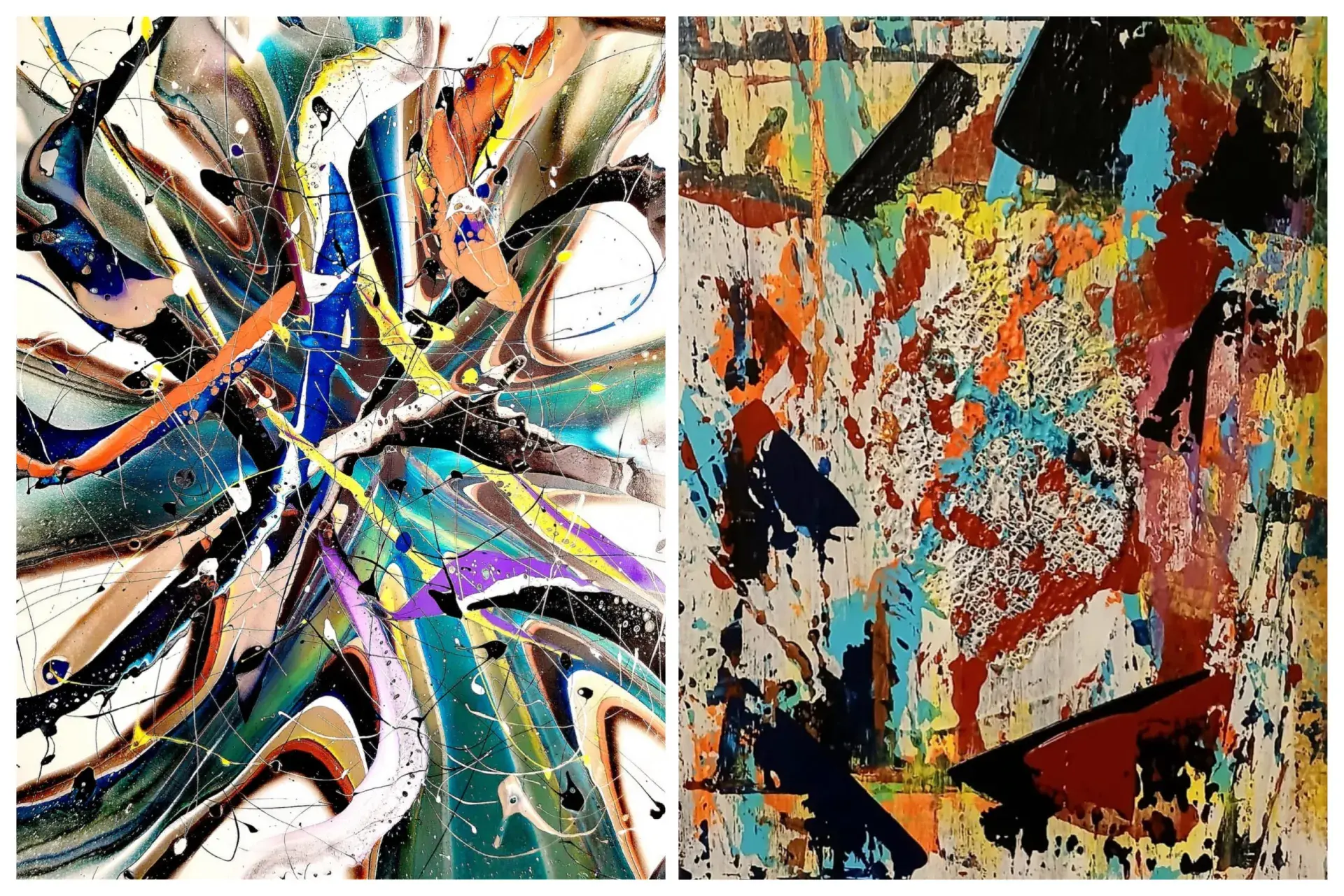 È dunque nel disordine interiore, nello scontro tra istinto e ragione, che si accende la scintilla della creazione. Quel caos, spesso percepito come ostacolo, diventa energia che plasma forme, colori, emozioni. Questo principio guida Tensioni Cromatiche, dove due stili artistici, diversi ma complementari, si intrecciano: da una parte la materia prorompente e stratificata di Marocca, dall’altra il flusso fluido e improvviso di Pavia.