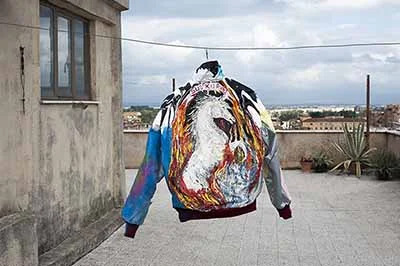 La radicalità del gesto espressivo, la scelta della pittura ad olio stesa in maniera materica su stoffe, sciarpe, giubbotti, bandiere – dall’aspetto chiaramente reliquiario – e la musica di Rodrigo D’Erasmo che sostituisce il naturale sfondo sonoro dei cori ultras con una composizione inedita per violini, rafforzano il distacco del simbolo dalla propria funzione calcistica per esaltarne la dimensione emozionale.