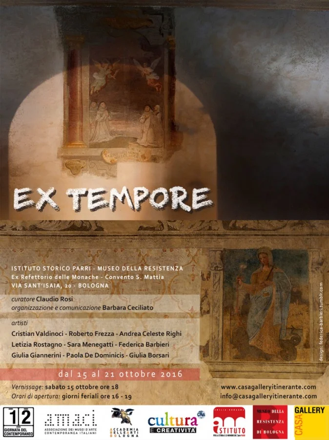 Casagallery, in occasione della XII Giornata del Contemporaneo, propone nella sede espositiva del “Refettorio delle Monache dell’ex Convento S. Mattia”, le opere realizzate da Cristian Valdinoci, Roberto Frezza, Andrea Celeste Righi, Letizia Rostagno, Sara Menegatti, Federica Barbieri, Giulia Giannerini, Paola De Dominicis, Giulia Borsari. Sono installati video e sculture, programmate performance, collocate fotografie, disegni e pitture, disposte su parete o su pavimento, nell’atmosfera “ex-tempore” che caratterizza queste realizzazioni.