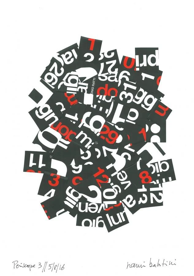 Il lavoro di Nanni Balestrini, fin dai primi anni Sessanta al confine tra immagine e parola, da sempre interdisciplinare e aperto alla contaminazione, ha fatto dell’indeterminazione e dell’apertura dei codici visivi e letterari una delle sue caratteristiche fondanti, fino a toccare recentemente con il film Tristanoil il tema della rigenerazione automatica, infinita e imprevedibile delle immagini. Nel caso dei collages di PERISCOPE tale attenzione alle leggi del caso e dell’imprevedibilità è associata a una ricomposizione formale estremamente accurata e talvolta quasi “pittorica” nella scelta dei colori e dei toni dominanti, nelle forme in cui si iscrivono, nelle cadenze delle lettere-segno che scandiscono i collages o nella curiosa ripetizione “a dittico” che alcuni di essi assumono.