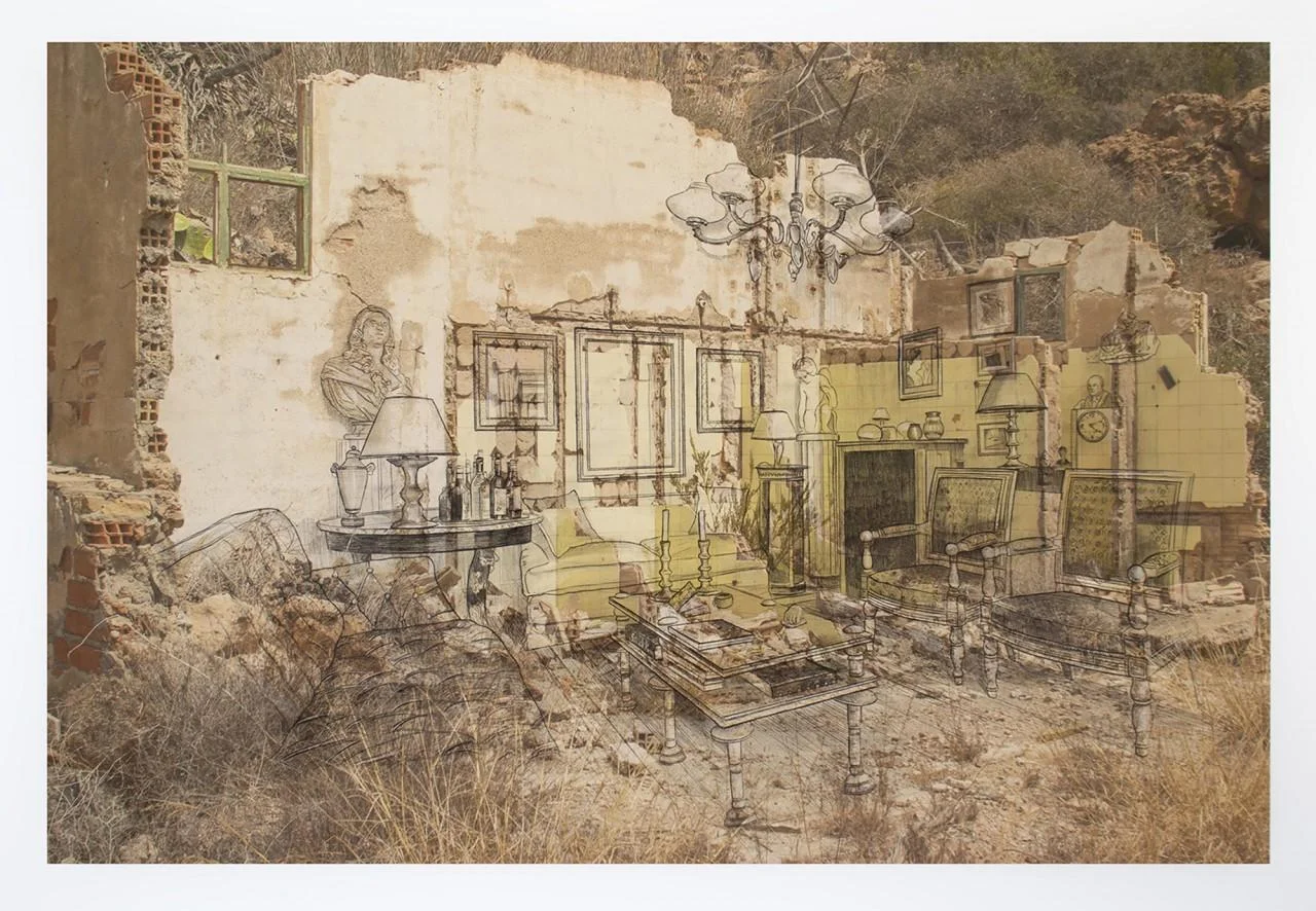 La sua ricerca parte da fotografie di luoghi abbandonati, percepiti come contenitori di un tempo sospeso. Su di essi poi l’artista disegna a china interni disabitati, in una sorta di ritratto di famiglia da cui sono stati elisi tutti i personaggi.