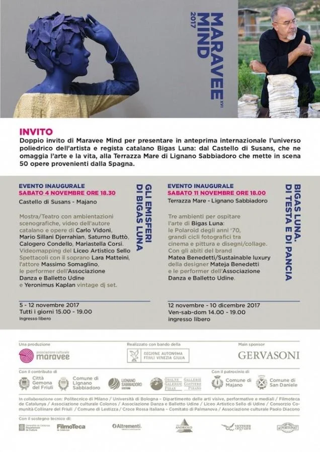 Dopo l’opening de Gli emisferi di Bigas Luna al Castello di Susans (visitabile fino a domenica 12 novembre dalle 15 alle 19), in cui innanzi al numerosissimo e partecipe pubblico è andata in scena, tra Ragione e Passione, l’arte e la vita dell’autore catalano su un teatro dell’arte che ha visto il protagonismo degli artisti Saturno Buttò, Calogero Condello, Mario Sillani Djerrahian, Maria Stella Corsi, Carlo Vidoni, del soprano Lara Matteini, dell’attore Massimo Somaglino, di Yeronimus Kaplan e delle performer dell’ADEB, Lignano Sabbiadoro si conferma come location nodale nel percorso culturale ideato da Sabrina Zannier, direttore artistico del Festival Maravee.