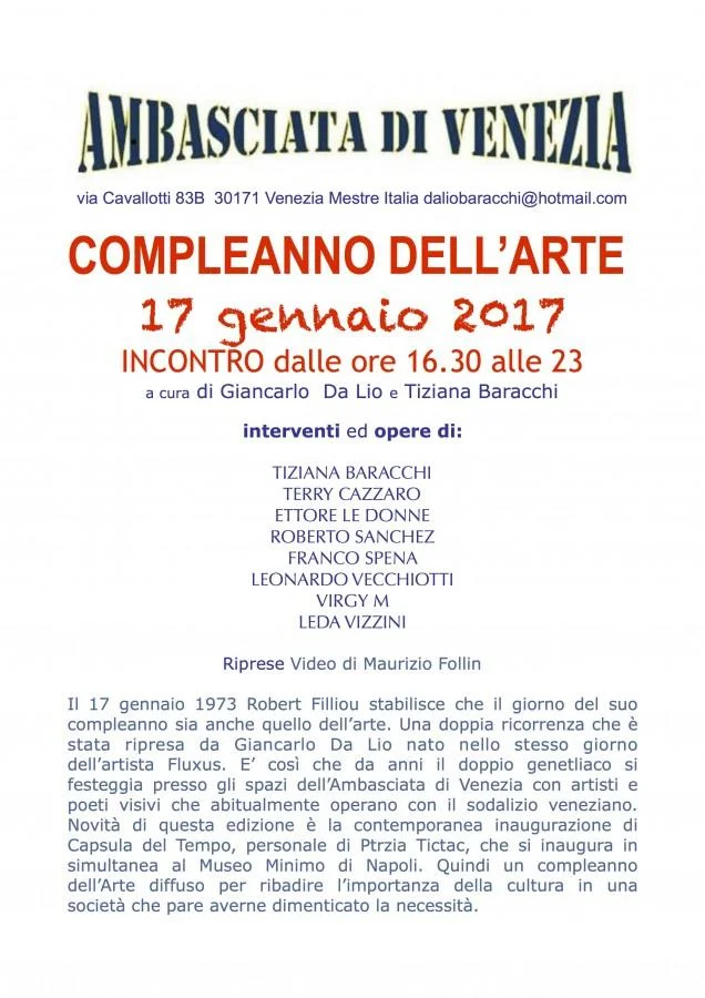 Il 17 gennaio 1973 Robert Filliou stabilisce che il giorno del suo compleanno sia anche quello dell’arte. Una doppia ricorrenza che è stata ripresa da Giancarlo Da Lio nato nello stesso giorno dell’artista Fluxus. E’ così che da anni il doppio genetliaco si festeggia presso gli spazi dell’Ambasciata di Venezia con artisti e poeti visivi che abitualmente operano con il sodalizio veneziano. Novità di questa edizione è la contemporanea inaugurazione di Capsula del Tempo, personale di Ptrzia Tictac, che si inaugura in simultanea al Museo Minimo di Napoli. Quindi un compleanno dell’Arte diffuso per ribadire l’importanza della cultura in una società che pare averne dimenticato la necessità.