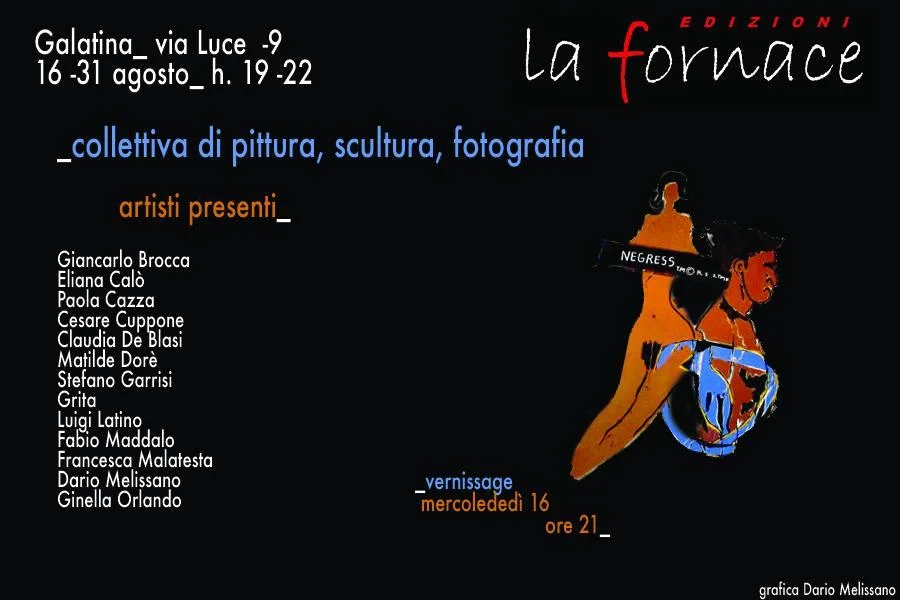 Dal 16 agosto al 31 agosto, a Galatina in via Luce, 9, saranno presenti 13 artisti salentini, in una nuova cornice espositiva, la saletta di Via Luce. Un ampio spazio dalle alte volte a stella, che dietro la supervisione del maestro Luigi Latino, e dell’associazione culturale La Fornace, si presta ad ospitare mostre, concerti, performance, cinema e teatro.