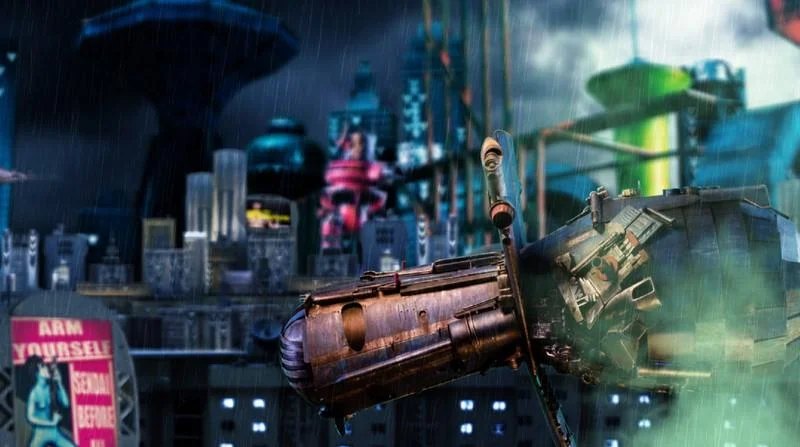 Luce blu e pioggia incessante, le astronavi sfrecciano nel cielo mentre i fasci di luce dei grandi robot guardiani pattugliano la terra. Manifesti di donne seminude e armate si stagliano sui palazzi inneggiando alla vittoria contro i “ribelli” a garanzia della pace. Sendai City wants you!